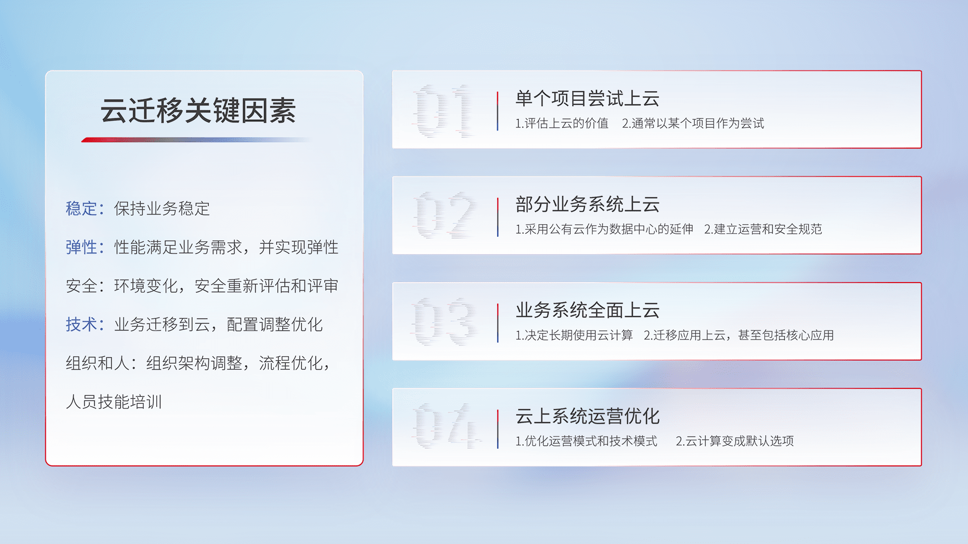 结合实际业务,,,从规划设计、、云平台选型、、、云原生改造、、数据迁移、、集成交付,,迁移全过程为客户识别最佳上云路径,,做好风险识别管理,,,设计网络架构、、身份权限、、、、安全审计合规、、、操作审计、、、、日志审计、、、、监控告警策略、、多站点容灾设计等,,,,对云上基础设施进行整体规划,,提升IT治理水平,,,以满足弹性、、高可用、、、高性能的需求。。。。